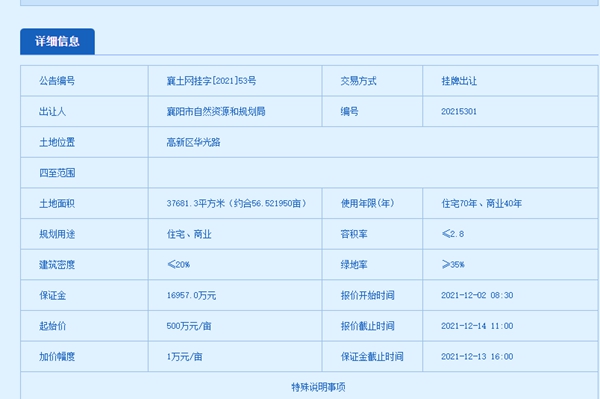 四至范围:东至襄阳市土地储备供应中心、南至湖北志强房地产开发(集团)有限公司、西至湖北志强房地产开发(集团)有限公司,北至环山南路