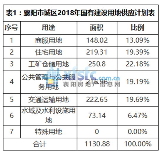 襄阳市城区2018年国有建设用地计划供应总量为1130.88公顷。其中商服用地为148.02公顷,住宅用地为219.31公顷(其中保障性安居工程用地55.15公顷,商品房用地164.16公顷),工矿仓储用地为250.80公顷,公共管理与公共服务用地为216.96公顷,交通运输用地为222.65公顷,水域及水利设施用地为73.14公顷,特殊用地为0.00公顷。