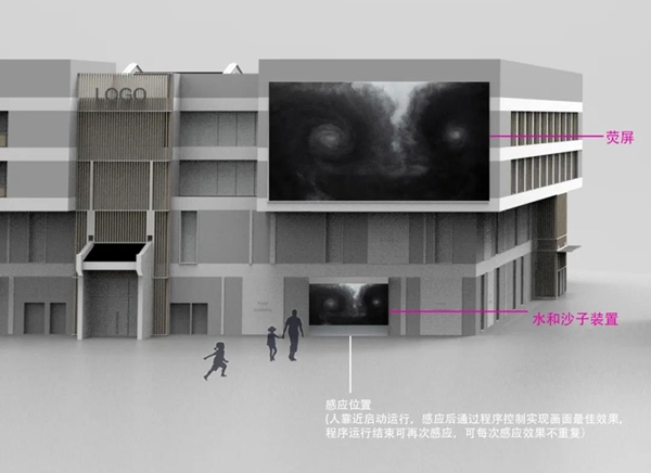作品呈现方式,在一层外墙建立玻璃水缸墙幕(单个点位或多个点位),水与沙子的运动变化则由让观众靠近互动及配套的程序产生,让画面出现最佳效果,然后通过实时记录水和沙的变化播放在高层更大的荧屏之上。