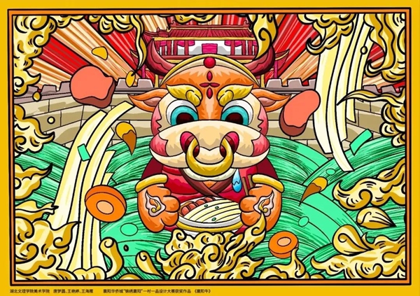 来自湖北文理学院美术学院的同学们,用手中画笔绘出新时代的“锦绣襄阳”,为牛肉面增添了新国潮的时尚风味。