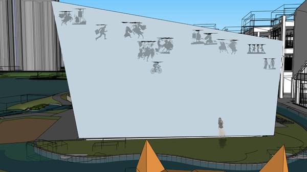 作品将襄阳三国时期金戈铁马人物的剪影与当下人们日常生活的剪影垂直于墙面,在同一天中,随着太阳东升西落,影子也会随之游走产生不同的变化。