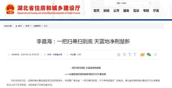 为深入推进城乡垃圾清扫全覆盖、地表垃圾全清零、归集垃圾全处理,从今年3月起,湖北省住房和城乡建设厅牵头、相关部门配合,在全省启动了“一把扫帚扫到底,干干净净迎国庆”活动,营造干净整洁、文明有序的城乡环境,以实际行动庆祝中华人民共和国成立70周年。
