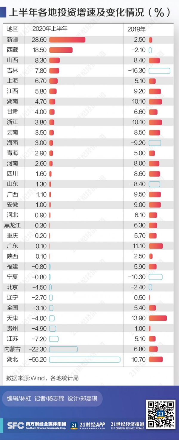 分省份来看,据21世纪经济报道记者统计,上半年已有22个省份投资增速为正值,其中新疆增速最高为28.6%。相比去年全年,新疆、吉林等8省份投资增速呈现加快态势。
