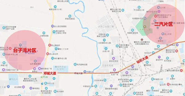 高新区的房地产开发建设,目前主要集中在两个区域:邓城大道以东,拥有成熟生活圈的的二汽片区;邓城大道以西,发展势头强劲的台子湾片区。