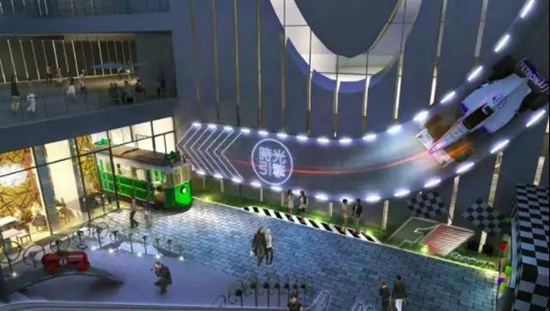 汽车主题下沉广场入口,一辆赛车宛若从天而降,驰入吾悦广场内。
