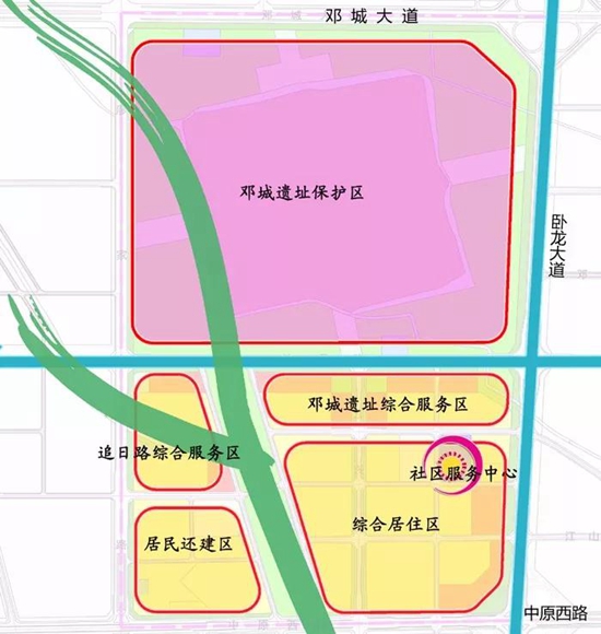 “一廊二轴”是指大李沟生态廊道、卧龙大道发展轴和追日路发展轴。“一心五区”是指社区服务中心、邓城遗址保护区、追日路综合服务区、邓城遗址综合服务区、居民还建区和综合居住区。