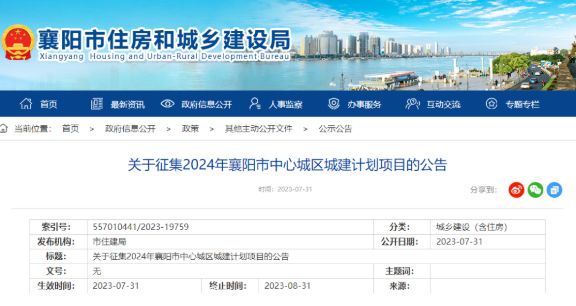 为使2024年实施的城建项目更加符合市民的愿望和需求,欢迎全市社会各界为襄阳城市建设建言献策,项目征集范围主要包括供水供气供热、排水防涝、污水提质增效、道路交通、环卫园林、老旧小区改造、城市更新、公共服务设施、历史文化名城保护等方面,提交的意见与建议需注明项目基本情况(现状如何、希望怎样建设或改造,预计建成后将发挥怎样的作用)。相关意见建议可以通过邮寄和电子邮件进行反馈,具体反馈方式按照建议征询表形式进行反馈,反馈时请留下姓名和联系方式,便于沟通交流,意见与建议征集时间截止2023年8月31日。