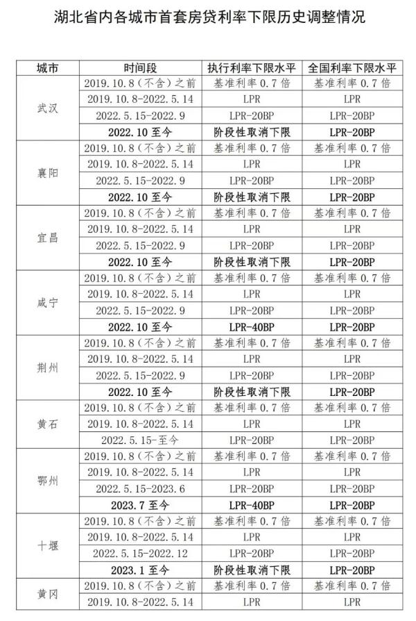 9月1日,中国人民银行湖北省分行发布湖北省内各城市首套房贷利率下限历史调整情况,详情如下:
