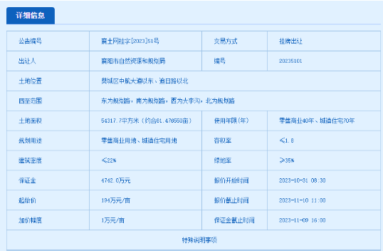 襄阳市国土资源网上交易系统 挂出樊城区一宗住宅、商业用地 起拍总价近1.58亿元! 总面积约81.48亩! 襄土网挂字[2023]51号 该地块位于 樊城区中航大道以东、追日路以北 土地面积54317.7平米 (约合81.47655亩) 起拍楼面价约1617元/㎡ 地块性质:零售商业用地、城镇住宅用地 容积率:≤1.8 建筑密度:≤22% 绿地率:≥35% 起始价:194万元/亩 宗地现场图 根据规划 建设用地面积54317.72平方米 城市道路面积8515.08平方米 地上计容建筑面积不大于97771.90平方米 建筑高度不大于35米 配套服务设施要求: 在用地内集中配建服务设施,按现行政策规定执行,与地块同步规划、同步建设、同步验收。 其中: (1)社区综合服务设施按照每100户配套30平方米且不小于400平方米标准配建,建成后按规定无偿移交给樊城区政府。 (2)配建独立占地且用地面积不小于2160平方米、建筑面积不小于1620平方米的6班幼儿园,建成后按规定无偿移交给樊城区政府。 (3)社区居家养老服务用房不小于750平方米,建成后按《襄阳市新建住宅小区配建养老服务设施“四同步”实施办法(试行)》执行。 (4)文化活动中心建筑面积不小于400平方米(含城市书屋100平方米),建成后由樊城区政府以成本价回购。 (5)社区卫生服务中心建筑面积不小于200平方米,建成后由樊城区政府以成本价回购。 (6)临支路布置建筑面积不大于500平方米的商业。 (7)配建建筑面积不小于50平方米公厕,需在临街建筑底层配建,公厕建成后无偿对外开放。