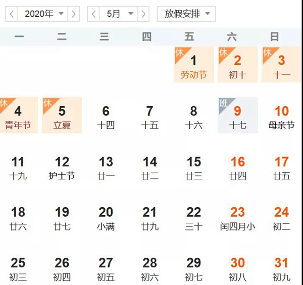 四、劳动节:5月1日至5日放假调休,共5天。4月26日(星期日)、5月9日(星期六)上班。