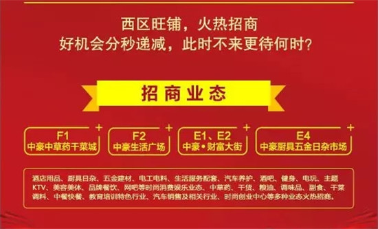 西区实行全业态集中招商,后期运营将围绕统一商业规划、统一运营管理、统一物业管理、统一信息管理、统一策划管理、统一店面规划、统一招商管理、统一培训学习,“八个统一”原则,科学规划,合理布局,让广大商户入驻有实惠,经营无忧虑。