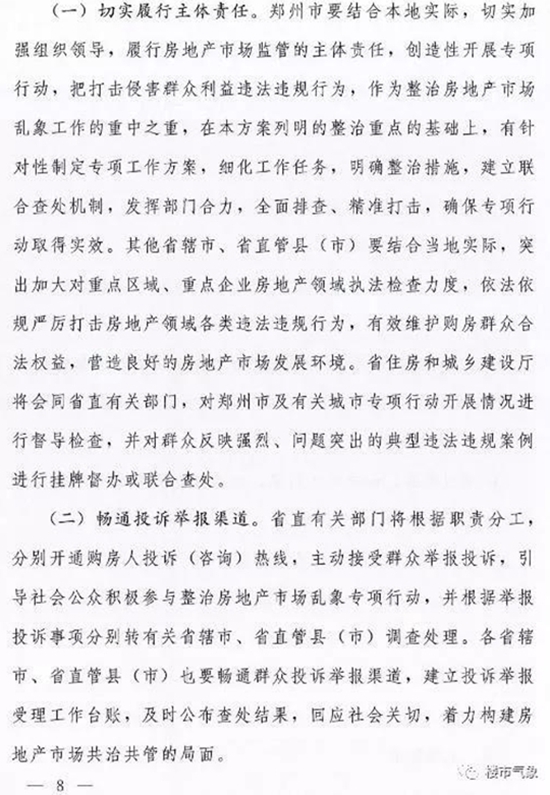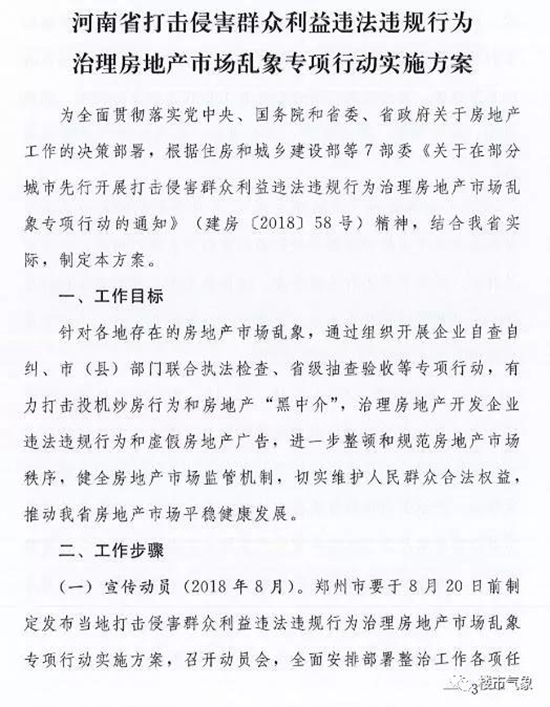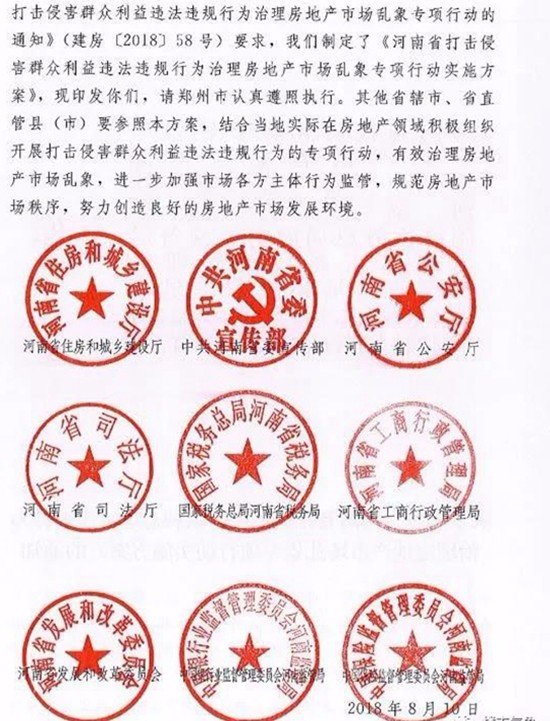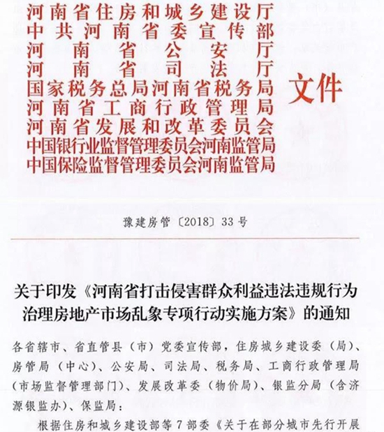 今天(8月21日),河南省住建厅、省委宣传部、省公安厅、省司法局、国家税务总局河南省税务厅、省工商行政管理局、省发展和改革委员会、中国银行业监督管理委员会河南监管局、中国保险监督管理委员会河南监管局9部门,联合发文《河南省打击侵害群众利益违法违规行为治理房地产乱象专项行动实施方案》的通知,打击投机炒房行为和房地产“黑中介”,治理房地产开发企业违法违规行为和虚假房地产广告,进一步整顿和规范房地产市场秩序,健全房地产市场监管机制,切实维护人民群众合法权益,推动河南省房地产市场平稳健康发展。