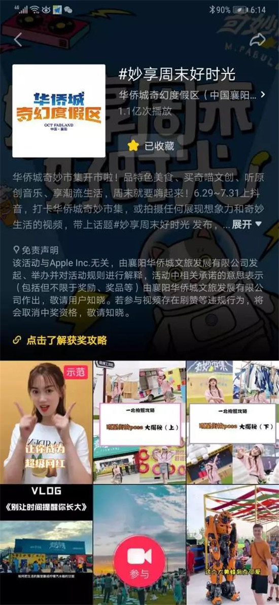 6月29日,华侨城奇妙市集在襄阳开幕,同步推出“妙享美好周末”的抖音区域挑战赛。上线一周,话题视频达上千条,霸屏抖音。各大百万级粉丝达人纷纷自发参与话题;