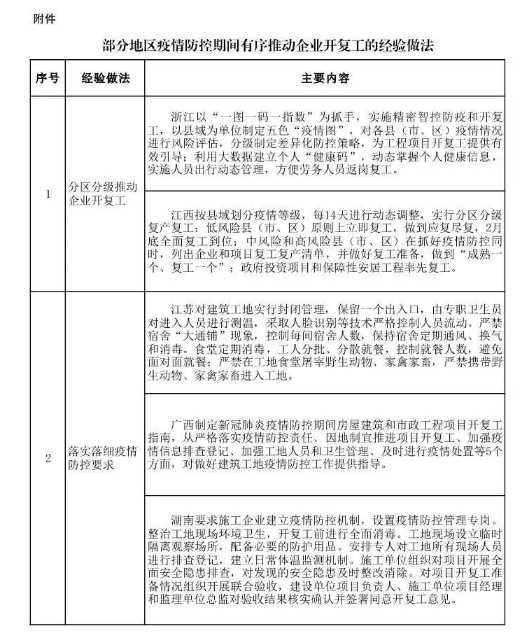 为贯彻落实《住房和城乡建设部办公厅关于加强新冠肺炎疫情防控有序推动企业开复工工作的通知》(建办市〔2020〕5号),有序推动房屋建筑和市政基础设施工程领域企业和项目开复工,现将部分地区疫情防控期间有序推动企业开复工的经验做法印发给你们。请结合地方实际学习借鉴,统筹抓好疫情防控和企业开复工工作。同时,各地要认真总结有序推进企业开复工工作的典型经验、存在的问题及相关建议,及时报我部建筑市场监管司。