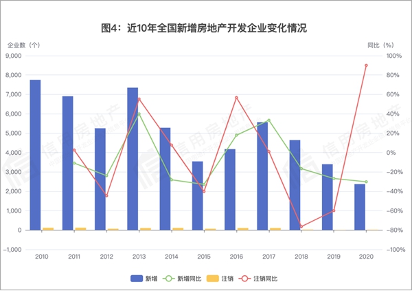 从近10年新增和注销的企业总量来看,新增开发企业从2017年开始,呈持续下降趋势,2020年新增企业数量是近十年的最低值,约为2371家。