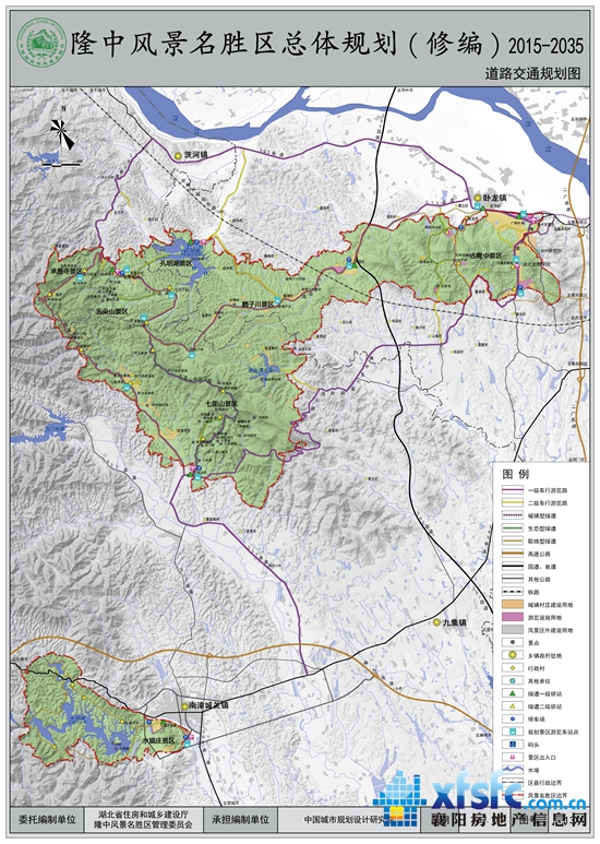 从规划总图上来看,新编制的隆中风景名胜区不仅有古隆中景区,还包括了鹤子川景区、孔明湖景区、承恩寺景区、五朵山景区、七里山景区、水镜庄景群等7处,其中古隆中、水镜庄、承恩寺、七里山、鹤子川等五大景区均为国家级名胜风景区,五朵山、七里山由于自然风光秀美,吸引游客量大,在本次编制中也被列入隆中风景名胜区总体规划的景区名单中。
