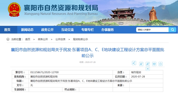 近日,自然资源和规划局公布了民发·东著项目位于襄州区A、C、E地块的公示方案。