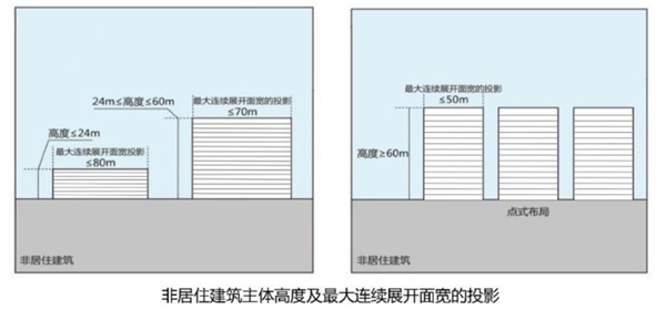·非居住建筑主体高度不大于24米时,最大连续展开面宽的投影不宜大于80米;