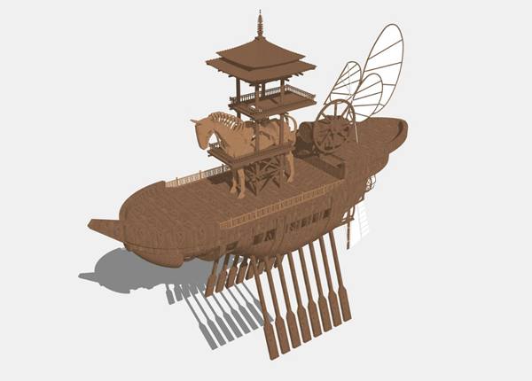 作品用夸张的手法塑造了一个超现实场景,用汉代的楼船、铜奔马、汉阙为基本造型元素,将他们组合成为一艘“超时空战舰”, 将襄阳地区特定历史文化与“南船北马”的地域特点表达出来,同时利用三国时期的典型人物形象用蒸汽朋克结合卡通风格杂揉出一幅超现实的场景,船尾的风帆在机械结构的带动下慢慢扇动,三国人物也随之旋转,船尾喷着蒸汽.....