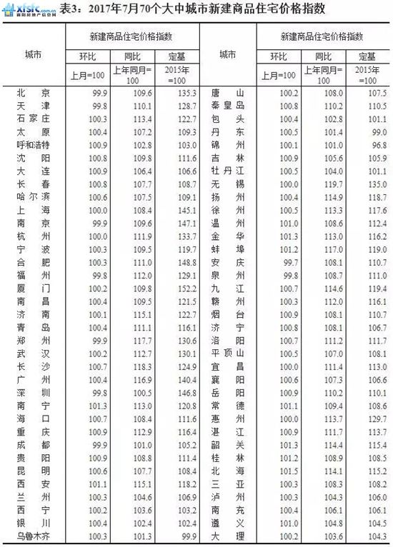 国家统计局昨日发布了2017年7月份70个大中城市住宅销售价格统计数据。