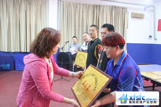 襄阳电力集团物业发展有限公司总经理宋建甫为荣获第二届襄阳市“物业杯”乒乓球赛女子单打第二名、男子单打第二名、男子团体第二名选手颁奖