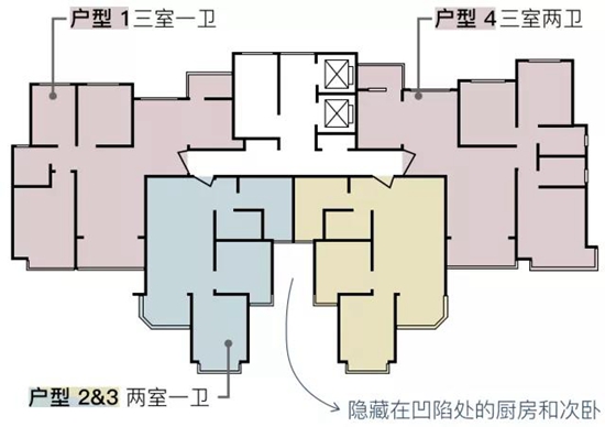 常见于一核三到十二户中间套,塞在采光最好的转角户型之间。