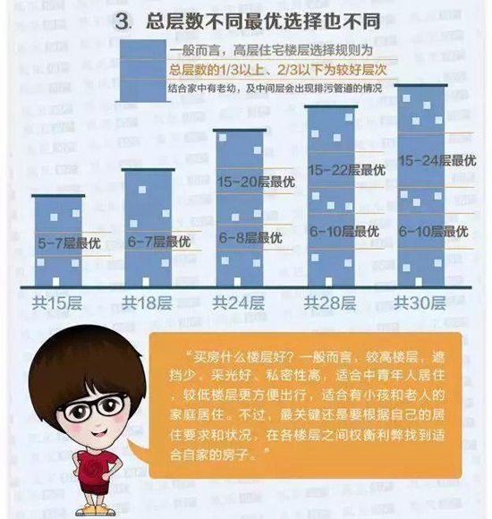 高层住宅的选择,很多人都会纠结选哪个楼层,高了怕不方便,低了怕遮光,中间怕扬灰,不需要纠结,一张图告诉你如何选择合适的楼层。