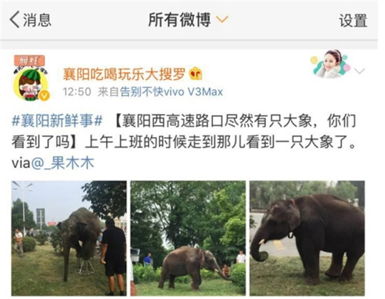 “失物招领,现樊西高速路口有一只大象,没人认领我牵走的”
