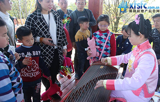 春风徐来,水波不兴,泥土的芬芳袭来搅动着这午后的阳光,密林中悄然响起的乐声,初听似涓涓小溪,骤然音调一转如急湍瀑布,昂扬激进惹得行人纷纷驻足观看,竟有绯衣美女密林小亭中拨弄古筝,手指轻挑悠扬的乐声随指尖流动,好一幅美景图!