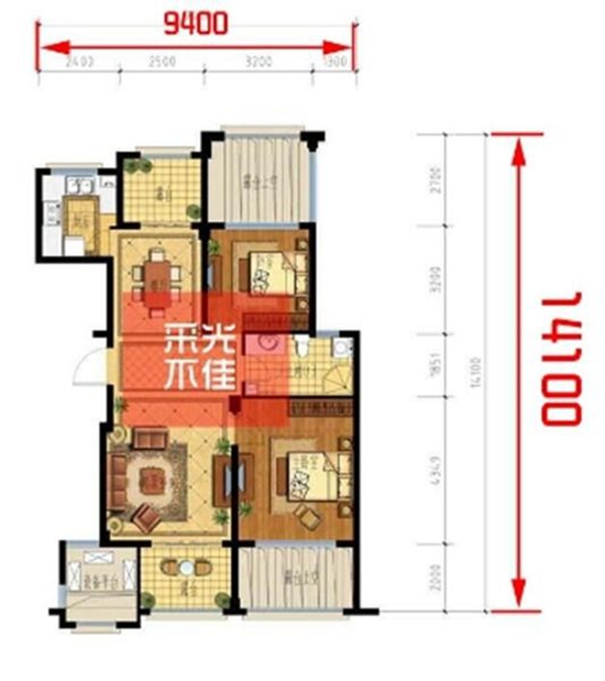这种户型除了南北实际对流面积小外,大的问题是进深太大,即便南北双阳台室内采光也不会太好。