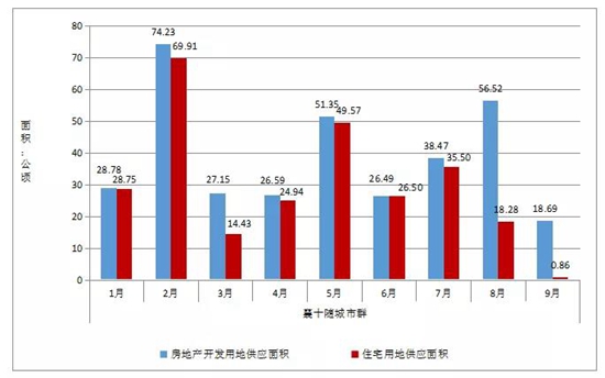 9月,襄十随城市群房地产开发用地和住宅用地供应面积均出现大幅度下跌;房地产开发用地供应面积环比下跌66.93%,住宅用地供应面积环比下跌95.30%。
