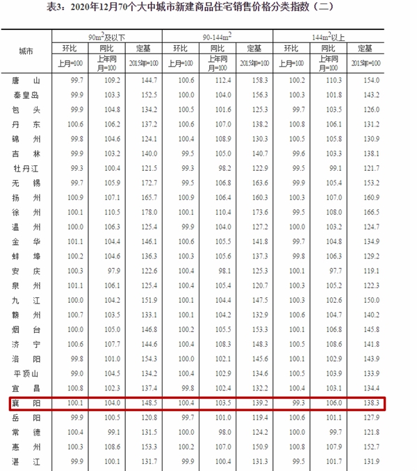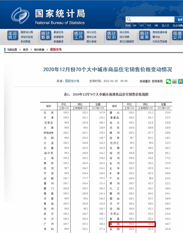 国家统计局网站1月15日发布《2020年12月份70个大中城市商品住宅销售价格变动情况》。