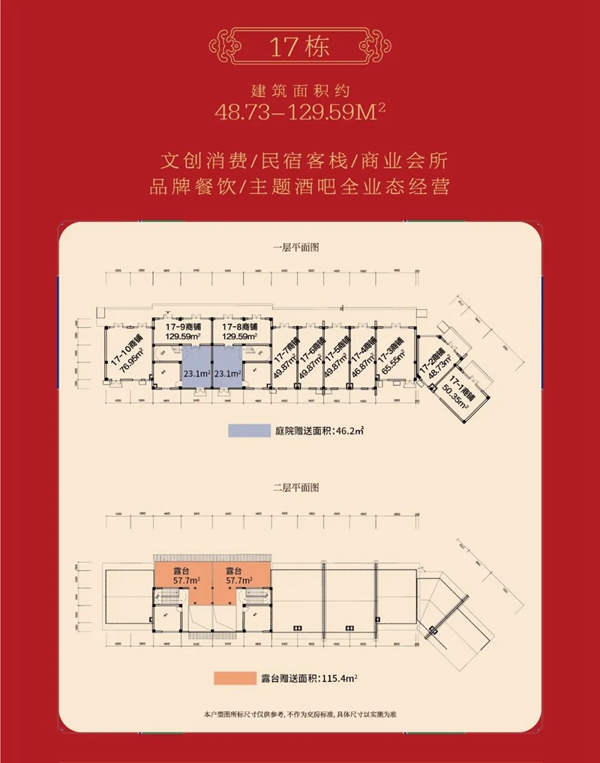 关圣古镇一期商铺,建面约48.73—281.8㎡的17栋商铺,就包含多达约115.4㎡的露台、约20.8㎡的庭院赠送面积,面临水系景观,拥有更多外摆空间,经营空间翻番,投资效益更高,适宜特色/水岸民宿,农特产品、旅游文创、奶茶饮品、茶吧、游乐设施等。入手自带人气光环的景区旺铺,坐享稳定长线丰厚回报!