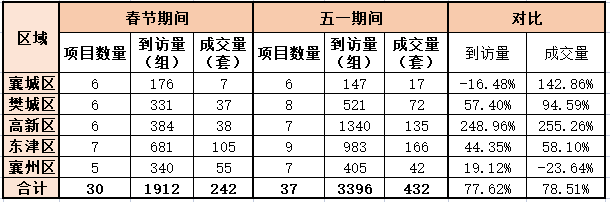 根据五一和春节期间的数据对比显示,今年“五一”假期期间,除了襄州区,四个区域的成交量都出现了不同幅度的上涨,其中高新区的成交涨势最为突出。襄城区6个项目的到访量下降了16.48%,但是成交量上涨了142.86%;樊城区8个项目,来访量上涨57.40%,成交量上涨了94.59%;高新区7个项目,来访量上涨248.96,成交量上涨255.26%;东津区9个项目,来访量上涨44.35%,成交量上涨58.10;襄州区7个项目,来访量上涨19.12%,成交量下降23.64%。