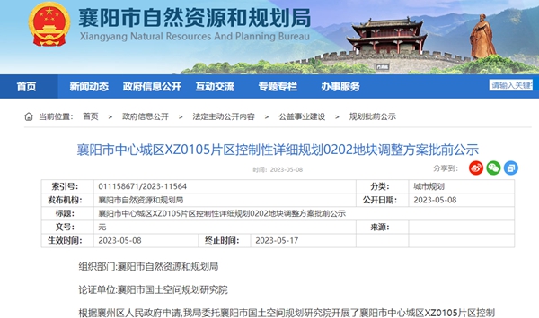 近日,襄阳市自然资源和规划局发布,襄阳市中心城区XZ0105片区控制性详细规划0202地块调整方案批前公示。
