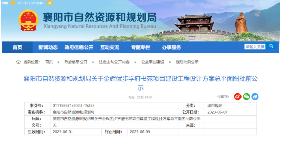 近日,襄阳市自然资源和规划局公示了:关于金辉优步学府书苑项目建设工程设计方案总平面图批前公示。