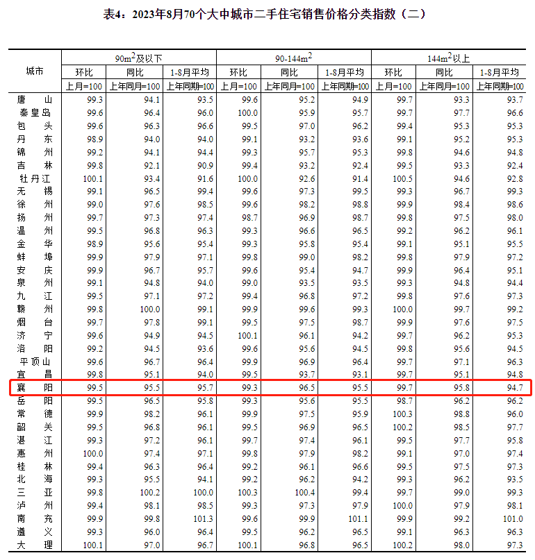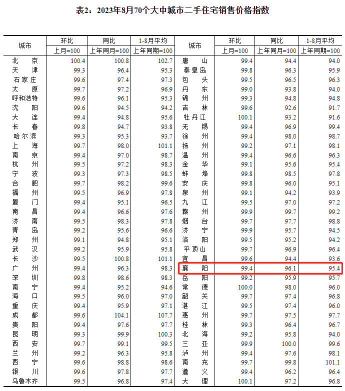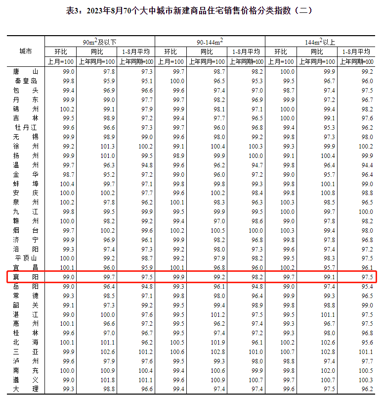 共有52个城市新建商品住宅售价指数环比下降,较7月份49城增加3城;1个城市持平;17个城市环比上涨,相比7月份20城减少3城。其中,襄阳新建商品住宅销售价格 ,环比下降0.2%,同比下降0.7%。