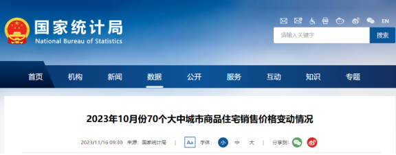 国家统计局今日(11月16日)发布的《70个大中城市商品住宅销售价格变动情况》显示,10月份70个大中城市中新建商品住宅和二手住宅销售价格环比上涨城市分别有11个和2个,比上月分别减少4个和2个;同比上涨城市分别有23个和3个,比上月分别减少2个和持平。