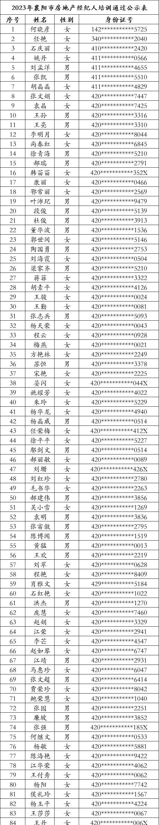 附表:2023年度襄阳市房地产经纪人持证上岗合格人员名单(培训184人 新学员69人)