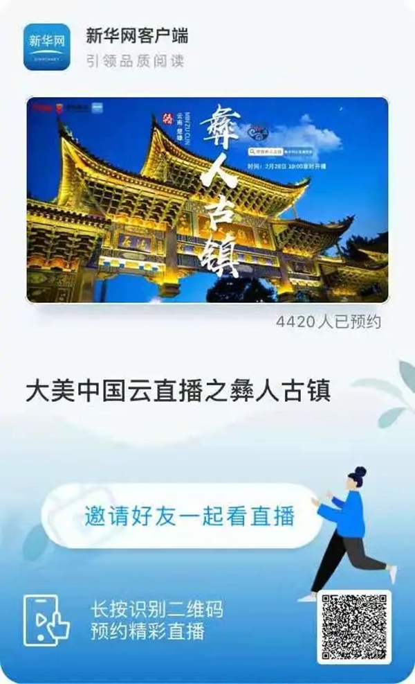 2月28日,彝人古镇登上新华网云直播首页,大美中国专业主播团队带领直播间所有观众“云游古镇”,感受彝族文化大观园的传统民俗,领略古镇大美景致。让观众在云上体验彝人古镇吃、住、行、游、购、娱的无限魅力。直播当晚,最高观看人数达53.5万人。