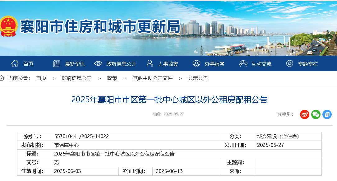 (一)在襄阳市住房和城市更新局官网发布《2025年襄阳市第一批中心城区以外公租房配租公告》。
