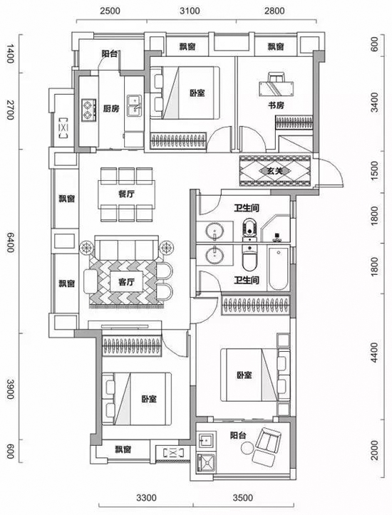 131.21㎡户型入户门的位置设计了玄关,私密性良好。在进门右手边是书房,紧接着是儿童房。再过来就是餐厨一体化的设计,餐厅与客厅也是衣襟相连,宴客、会客都十分方便。而且,形成了超长的6.4米横厅,横厅以整面窗体与户外相连,呈现出270°广角视野,观景效果极佳。最里面是主卧和客卧,私密性非常好,可以保证安静的休息和睡眠。主卧还带有阳台,通风采光效果俱佳。我们可以看出整个户型被飘窗和阳台包裹,具备通风、采光、隔热、降噪多种功能。而且,各功能分区布局合理,动静皆宜。适合三口之家、五口之家居住。