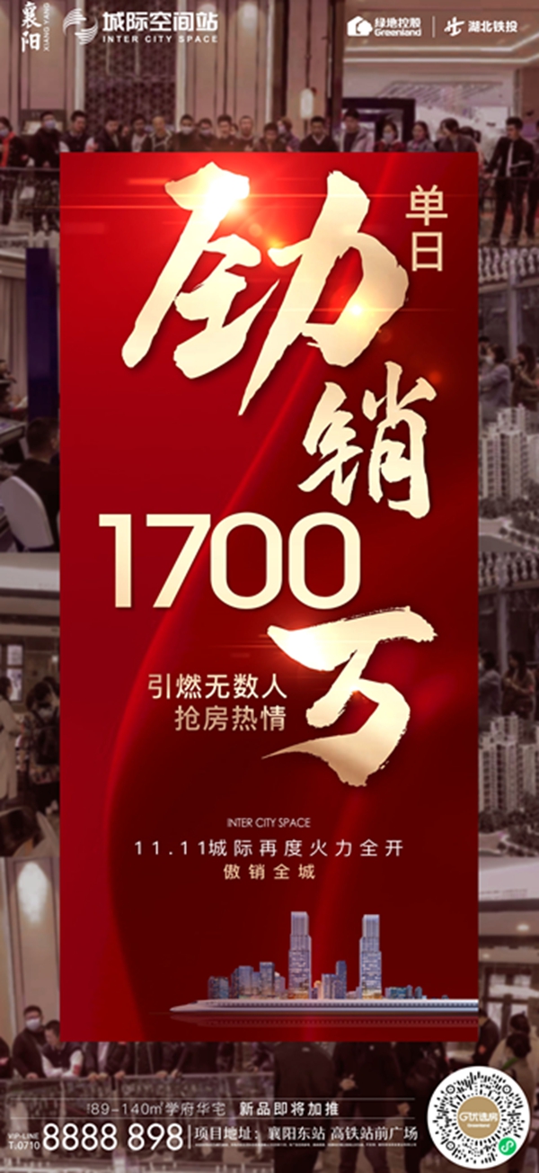 全配套、超高性价比,令城际空间站一路冠领襄阳,一路热销。从去年首开两小时破5亿销售额,再到10月国庆七天来访超1200组,劲销113套斩获1.13亿,11月绿地11.11 万人大惠战 线上在线人数43万+,双十一当天成交18套。