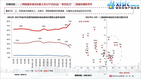 今年市场的各项特征,一个就是政策目标还是向左,市场向右。第二个特征就是三四线城市比重特别高。1-4月或者1-5月的时候,三四线城市面积比重占75%,去年则是66%。你别看这10个百分点,10个百分点对于整体市场影响非常大的,今天一二线城市比重下降10个百分点,今年上半年全靠三四线城市。