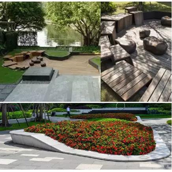 将绿植沿直线种于地面,高低错落的阶梯,层层的窗台和柱廊,重叠的花架和刚硬的栏杆,它们的有序排列,增添了园林景观的律动美和节奏感,丰富了沿路景观。铺装采用流畅的抛物弧线设计,为了融于周围自然环境,在铺装之间留有浅草渗水缝隙边框出自然形态。